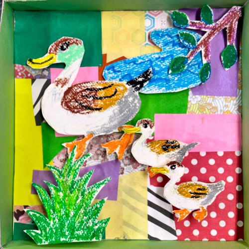 3D画(2) 描いた絵を切り取って浮き出るように張り付けることで奥行きのある作品を描きます |