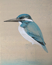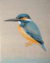 羽や顔の表情など細部まで描き込んで完成です。 粒子が細かい岩絵具を刷毛や平筆で薄くフィルターを被せるような感覚で塗るのも、全体を調和させるのに有効です。 さらに、落款やサインを入れると画面も引き締まり、完成度もより一層高まります。 |