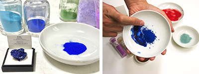 重ね塗りをすることでより鮮明な発色となります。 特に粒子が粗い岩絵具は、一度塗っただけでは絵具の粒の隙間から下地が透けて見える状態となるので、乾きをみて重ね塗りを繰り返すか、絵皿の底に沈殿している岩絵具を筆先ですくい取って、画面上に絵具を置くような感覚で塗ると、岩絵具特有の存在感と発色が得られます。