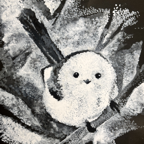 モノクロ点描画 黒またはグレーの画用紙に白と黒の絵具のみを使って点描します |