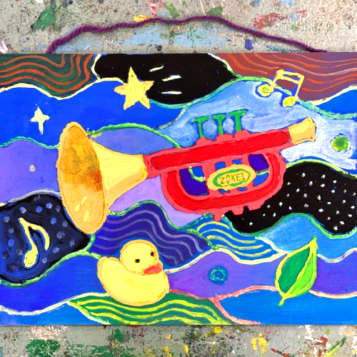 モデリング板絵(2) 板に下地塗をして選んだモチーフを描き輪郭線などを盛り上げます |